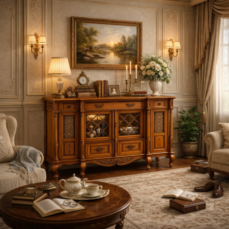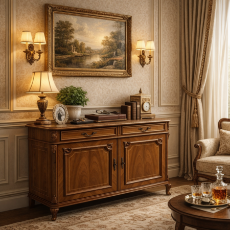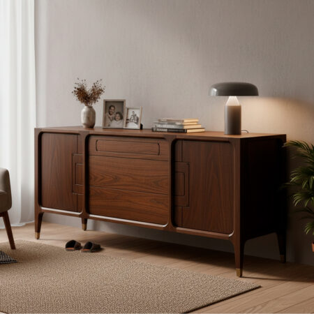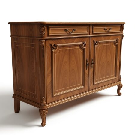 Комод из массива ореха "Альгамбра" воплощает утончённую классику с безупречными пропорциями и благородной отделкой. Лаконичные филёнчатые фасады с деликатной резьбой, изящные изогнутые ножки и элегантные ручки создают сдержанный, но статусный образ. Натуральный орех раскрывается в насыщенном тёплом тоне, придавая мебели глубину, уют и ощущение ручной работы высокого уровня.