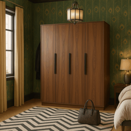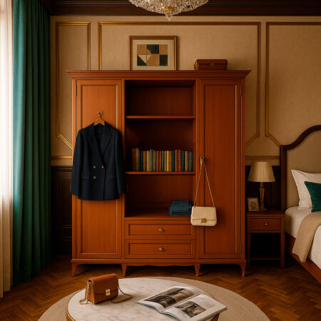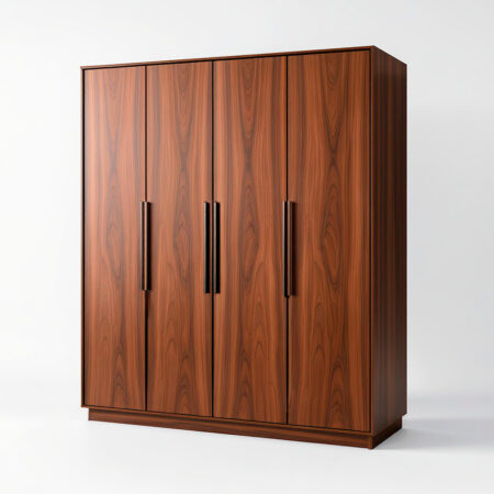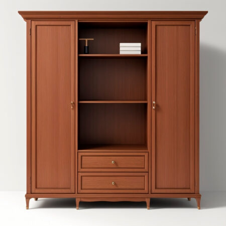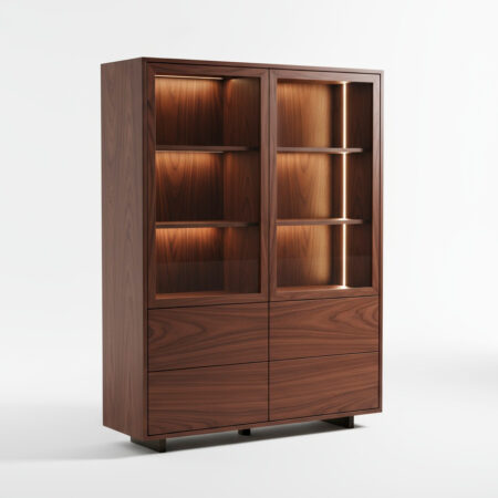 Изготовленная из ценных пород древесины и облицованная шпоном ореха экстра-класса, витрина демонстрирует природную глубину текстуры и благородный оттенок материала. Поверхность покрыта экологичными итальянскими лакокрасочными материалами, что обеспечивает долговечность и шелковистое прикосновение.