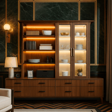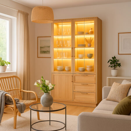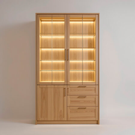 Оснащённая фурнитурой Blum, она гарантирует плавное и бесшумное открывание. Встроенная LED-подсветка эффектно подчеркивает витринное пространство, создавая мягкий акцент на содержимом и добавляя интерьеру выразительности.