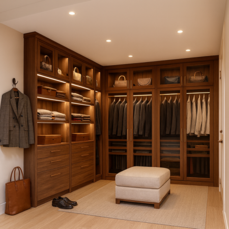 Гардеробная система "Амирадор" гармонично вписывается в интерьеры современной классики, неоклассики, минимализма премиум-класса, контемпорари, становясь не просто мебелью, а архитектурным элементом пространства.