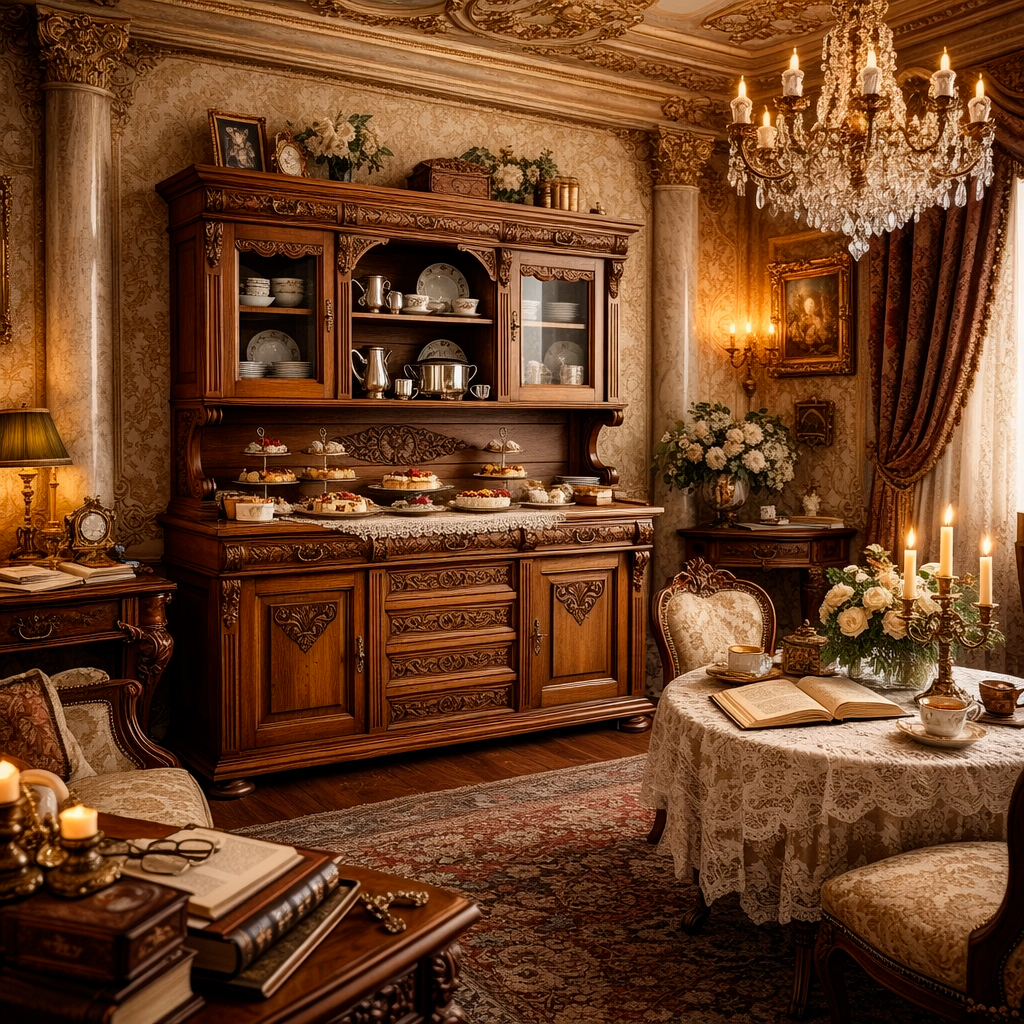 Буфет «Монтано» из массива и шпона ценных пород дерева является выразительным воплощением классической дворцовой эстетики и высокого мебельного искусства. Богатая резьба ручной работы, изящные декоративные кронштейны, фигурные фасады и архитектурно выверенная надстройка создают образ респектабельной роскоши и подчёркнутой статусности. Витринная часть со стеклянными дверцами позволяет эффектно демонстрировать сервизы и коллекционные предметы, а тёплый насыщенный оттенок древесины усиливает ощущение уюта и благородства.