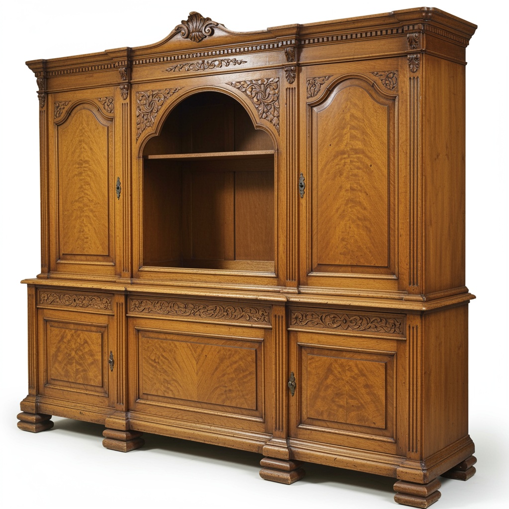 Буфет «Доминик» в классическом стиле представляет собой выразительный образец благородной мебели с архитектурной композицией и выверенными пропорциями. Центральная ниша с арочным проёмом формирует эффектный визуальный акцент, подчёркнутый симметричными фасадами и тонкой резьбой. Чёткая геометрия, массивный карниз и устойчивое основание придают изделию ощущение основательности и статуса.