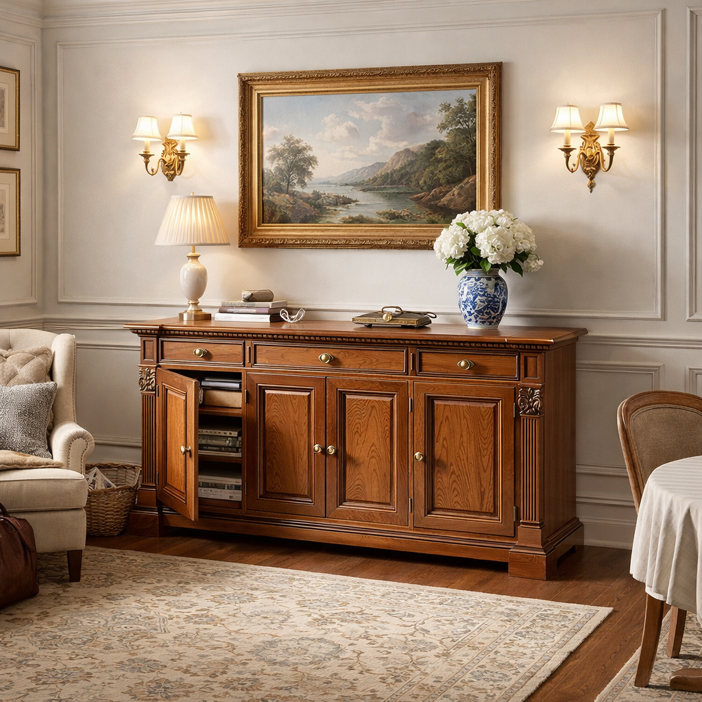 Изделие выполнено из ценных пород древесины с отделкой шпоном ореха экстра-класса, который подчёркивает естественный рисунок волокон. Все поверхности покрыты экологичными лакокрасочными материалами из Италии, сохраняющими природную фактуру и долговечность отделки.