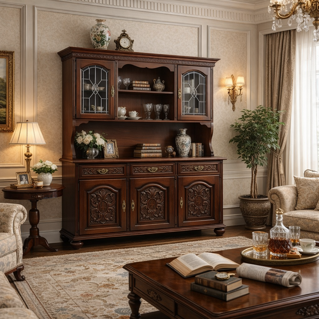 Буфет «Вилларе» из массива и шпона ценных пород дерева является утончённым воплощением классической европейской эстетики и традиций высокого мебельного мастерства. Строгая симметрия корпуса сочетается с выразительной резьбой ручной работы на фасадах, декоративным карнизом и элегантными витринными дверцами со стеклом и художественной расстекловкой. Глубокий тёплый оттенок древесины подчёркивает благородство форм и создаёт атмосферу респектабельного уюта.