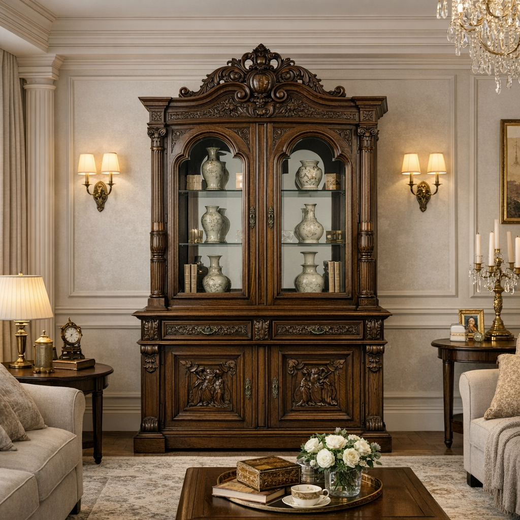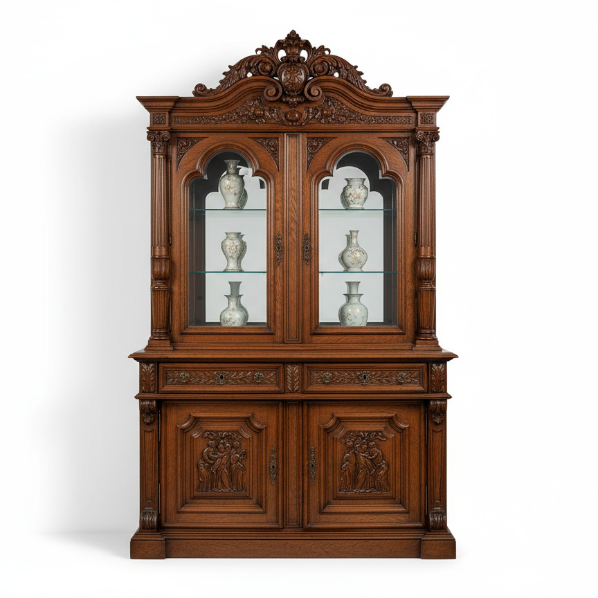 Корпус изготовлен из ценных пород древесины, с облицовкой натуральным шпоном экстра-класса (орех), тщательно подобранным по рисунку волокон. Глубокий тёплый оттенок подчёркивает рельеф резьбы и придаёт мебели благородную патину. Верхняя витринная часть со стеклянными полками предназначена для эффектной демонстрации фарфора, хрусталя или коллекционных предметов, нижний объём с глухими фасадами обеспечивает практичное и скрытое хранение.