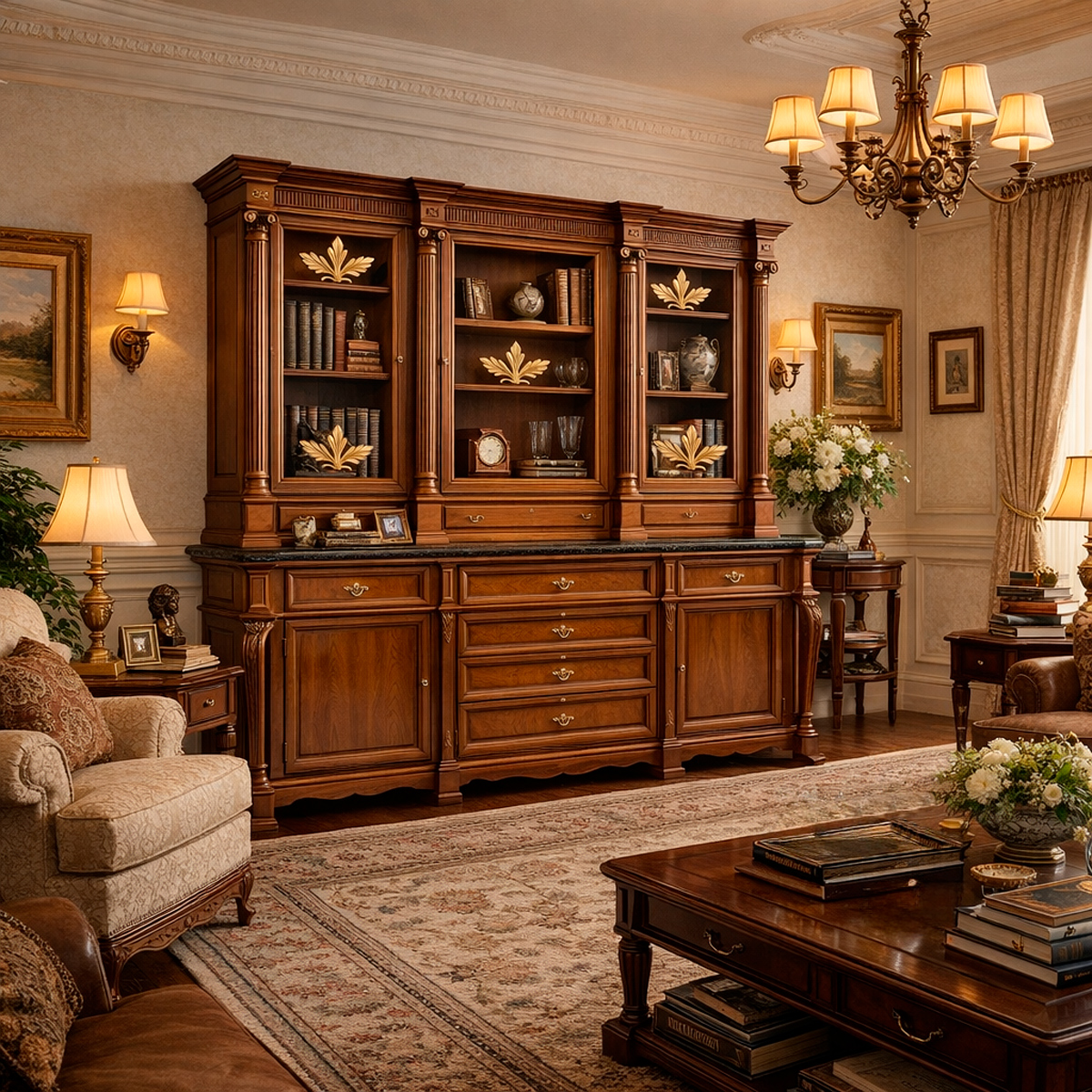 Верхняя витринная часть с колоннами и стеклянными фасадами, декоративные резные элементы и строгая карнизная линия формируют торжественный силуэт. Нижний модуль с распашными фасадами и системой выдвижных ящиков обеспечивает продуманную функциональность, сохраняя симметрию и статусный облик композиции. Столешница выполнена с использованием натурального камня, подчёркивающего премиальность модели.