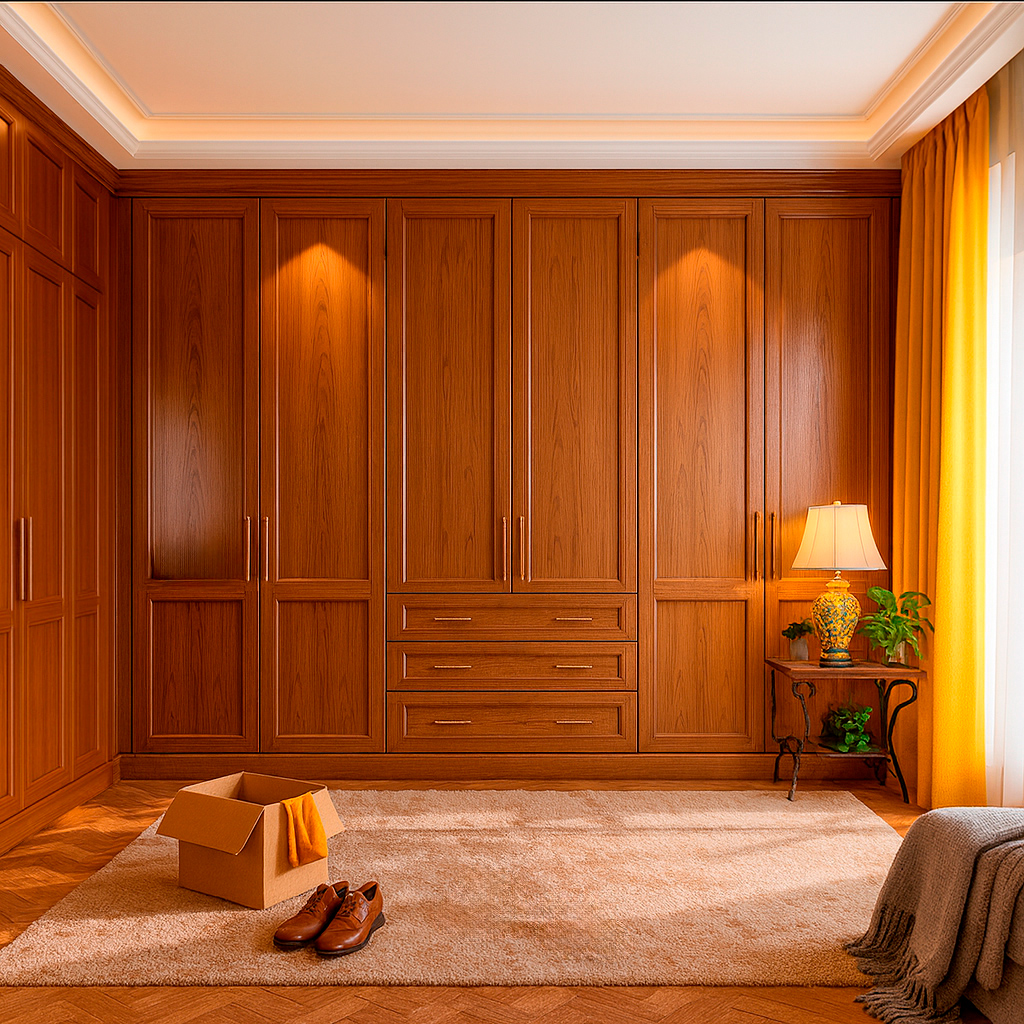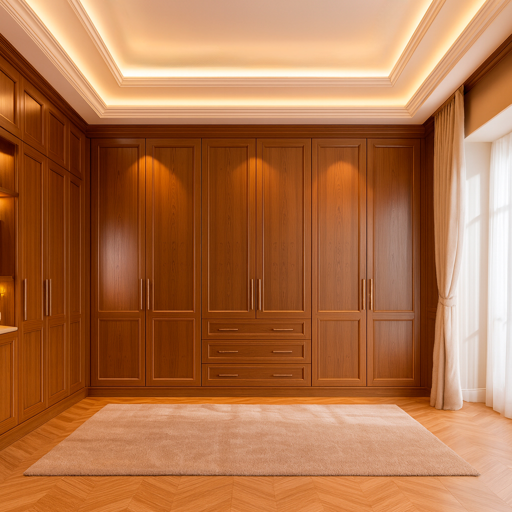 Интегрированные открытые секции, гардеробные модули с подсветкой, вместительные ящики и скрытые ниши создают баланс между эстетикой и эргономикой. Мягкое встроенное освещение подчёркивает фактуру натурального дерева и придаёт интерьеру атмосферу уюта и камерной роскоши.