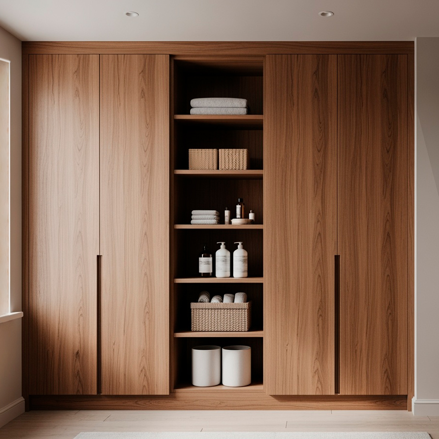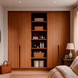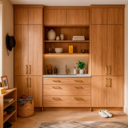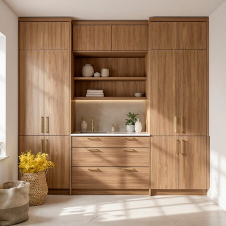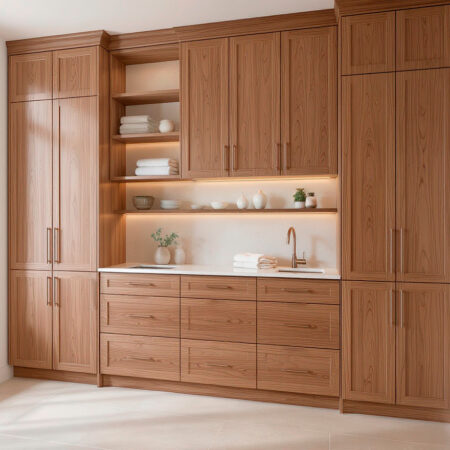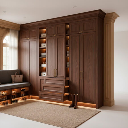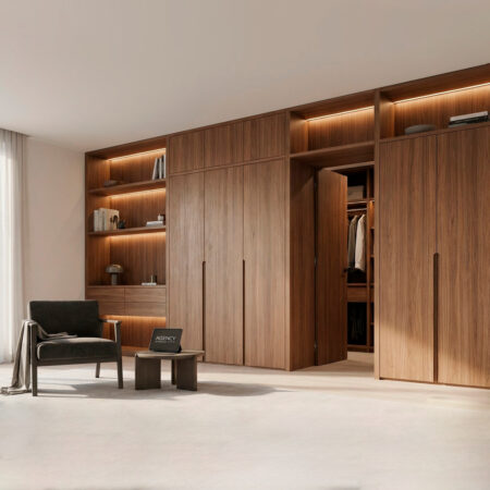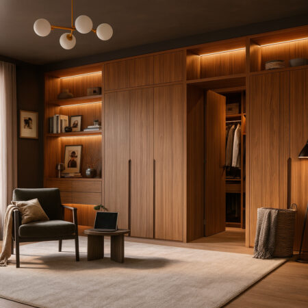 Лаконичные вертикали фасадов, интегрированные ручки, открытые ниши с подсветкой и скрытые гардеробные секции создают современную аристократичность и подчёркивают статус пространства. Встроенное освещение мягко акцентирует фактуру дерева и добавляет интерьеру глубину и атмосферность.