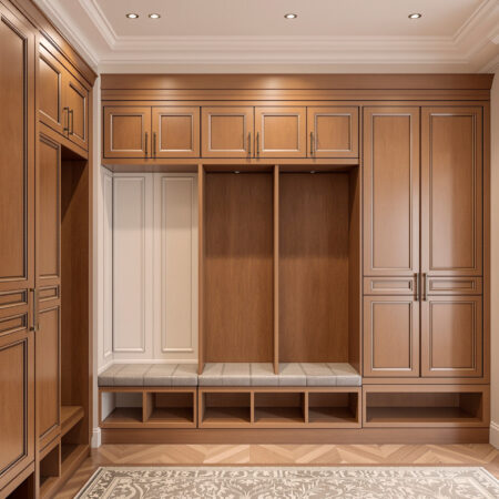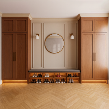 Композиция объединяет высокие шкафы для хранения, аккуратную мягкую скамью и функциональные обувные секции, создавая продуманное пространство для ежедневного комфорта. Вся подвижная фурнитура — выдвижные механизмы и петли — выполнена Blum, обеспечивающей эталонную плавность, бесшумность и долговечность.