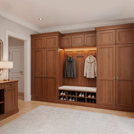 Центральный модуль оснащён вместительными выдвижными ящиками и открытыми нишами с теплой подсветкой, а боковые секции включают полноразмерные шкафы и удобную мягкую зону для переобувания. Вся механика выполнена на фурнитуре Blum, обеспечивающей бесшумное закрывание, мягкий ход и безупречную долговечность. Покрытие выполнено экологичными итальянскими лакокрасочными материалами, которые сохраняют природную красоту ореха и защищают его от износа.