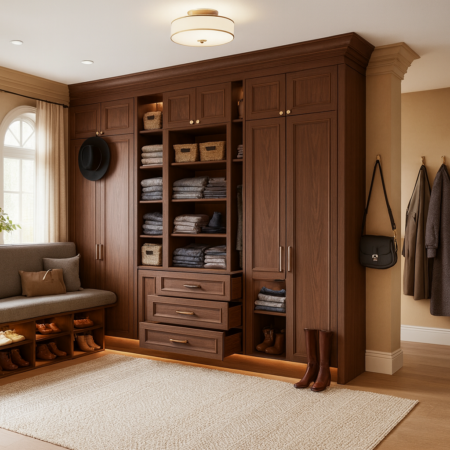 Мебельный ансамбль "Эдельхольц" для прихожей выполнен из натурального ореха и облицован шпоном ореха экстра-класса, подчёркивающим глубокий шоколадный тон, изящные переливы волокон и выразственную текстуру породы. Классические филёнчатые фасады, продуманные пропорции и акцентная латунная фурнитура создают ощущение статусного европейского интерьерного стандарта.