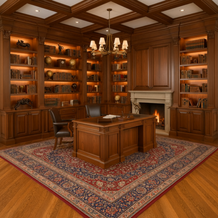 Профилированные карнизы, классические филёнки, встроенные открытые секции и выверенная геометрия придают комплексу монументальность и аристократическую выразительность. Интегрированная подсветка мягко подчёркивает фактуру дерева и наполняет пространство камерным, статусным светом.