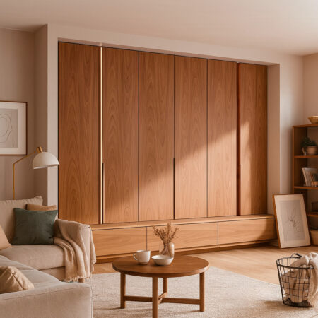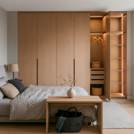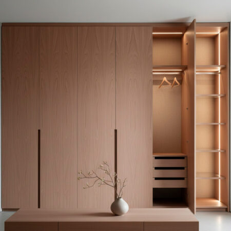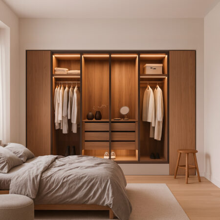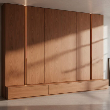 Функциональность продумана на уровне премиальных стандартов: вместительные секции для хранения, выдвижные ящики и скрытые ниши интегрированы в единый объём без визуального шума. Все механизмы оснащены фурнитурой Blum, обеспечивающей плавное, бесшумное открывание, точную работу доводчиков и долговечность при интенсивной эксплуатации.