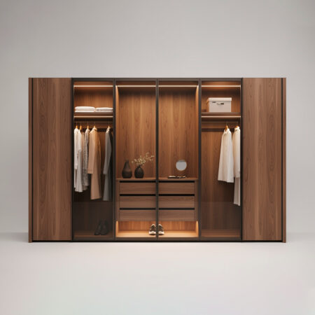 Корпус и фасады изготовлены из ценных пород древесины с применением шпона ореха экстра-класса, отличающегося мягким, благородным рисунком волокон и тёплой натуральной палитрой. Тщательный подбор и ориентация шпона обеспечивают цельность композиции и ощущение монолитности, характерное для мебели высокого класса.