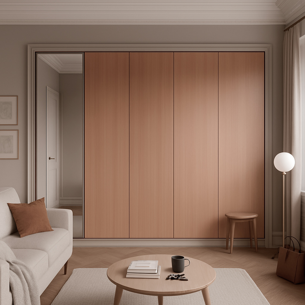 Гардеробная система "Паласиар" представляет собой образец сдержанной премиальной эстетики, в которой современный минимализм сочетается с благородством натуральных материалов. Чёткая ритмика фасадов, утопленные линии и пропорциональная симметрия формируют цельный архитектурный объём, визуально расширяющий пространство и подчёркивающий статус интерьера.