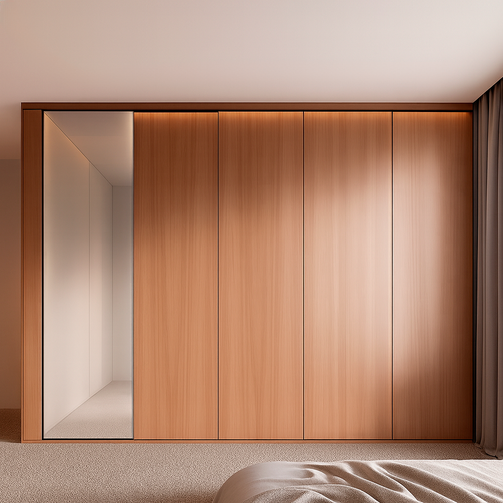 Интегрированные открытые секции, гардеробные модули с подсветкой, вместительные ящики и скрытые ниши создают баланс между эстетикой и эргономикой. Мягкое встроенное освещение подчёркивает фактуру натурального дерева и придаёт интерьеру атмосферу уюта и камерной роскоши.