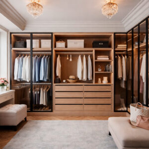 Функциональное наполнение организовано на уровне премиальных гардеробных систем: секции для одежды на вешалах, вместительные полки и выдвижные ящики интегрированы в единый объём. Все выдвижные элементы и раздвижные механизмы оснащены фурнитурой Blum, гарантирующей плавный, бесшумный ход, точную работу доводчиков и долговечность в ежедневной эксплуатации.