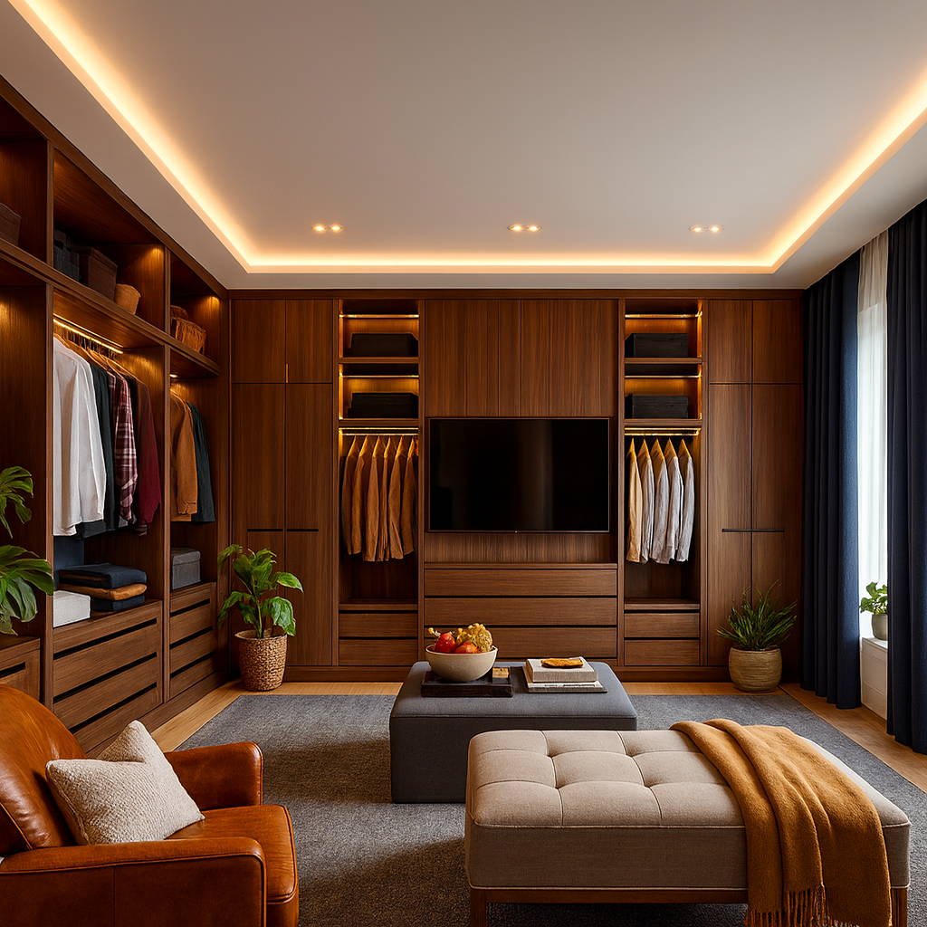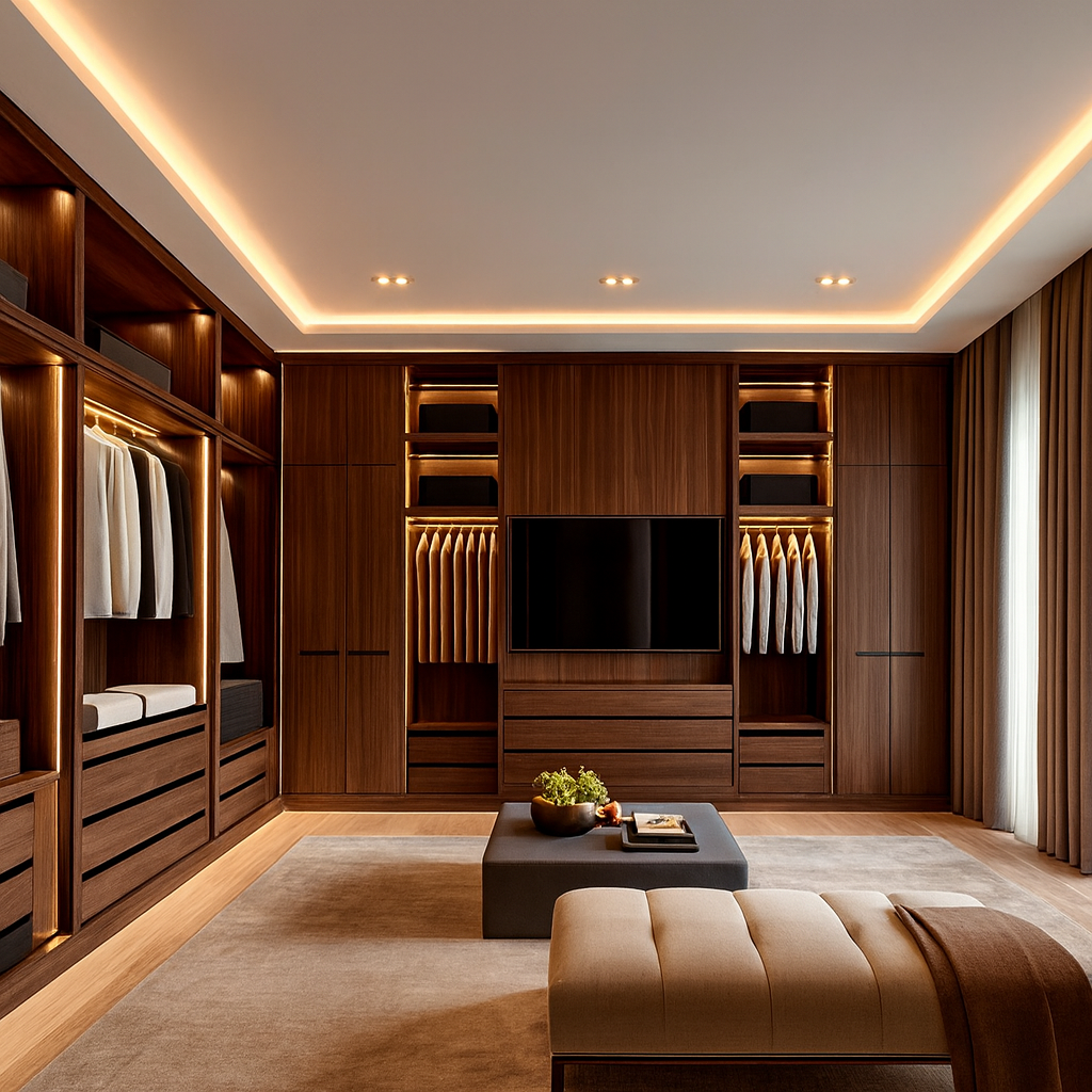 Корпус и фасады изготовлены из ценных пород древесины с использованием шпона ореха экстра-класса. Натуральный орех легко читается по глубокому тёплому оттенку и плавному, однородному рисунку волокон без резких контрастов. Шпон тщательно подобран по тону и направлению текстуры, обеспечивая визуальную цельность и премиальное качество исполнения.