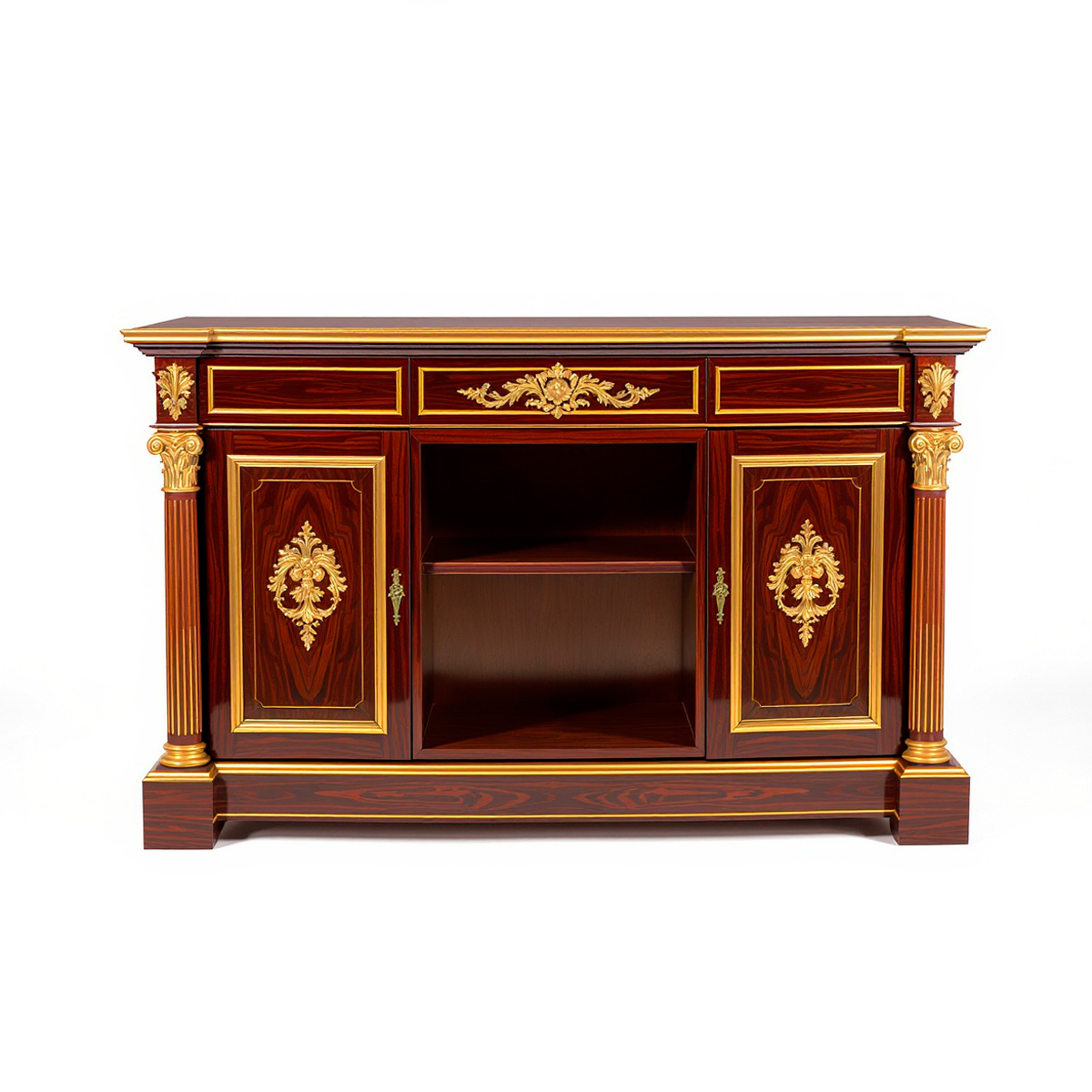 Фасады оформлены шпоном дуба экстра-класса с тщательно подобранным рисунком, подчёркивающим глубину цвета. Декоративные элементы — золочёные орнаменты, пилястры с каннелюрами и профилированный карниз — формируют изысканный, статусный силуэт. Центральная открытая ниша добавляет функциональности и лёгкости композиции.