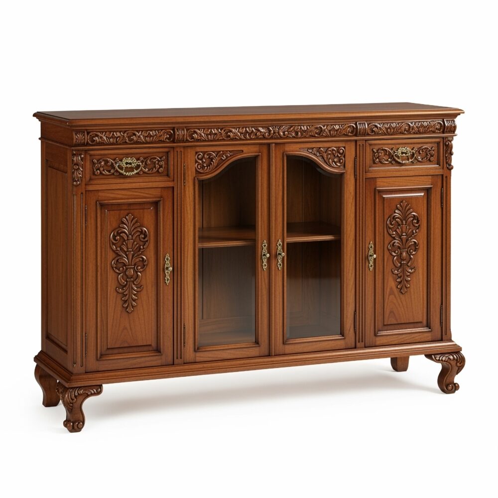 Комод «Вестфалия» премиум-класса из ореха воплощает в себе традиции европейского мебельного искусства и безупречное качество исполнения. Гармоничное сочетание глухих и остеклённых фасадов, выразительная ручная резьба по карнизу и дверцам, изящные ножки с мягким изгибом формируют благородный и уравновешенный силуэт. Тёплый ореховый оттенок подчёркивает глубину текстуры древесины и придаёт мебели статусный, респектабельный характер.