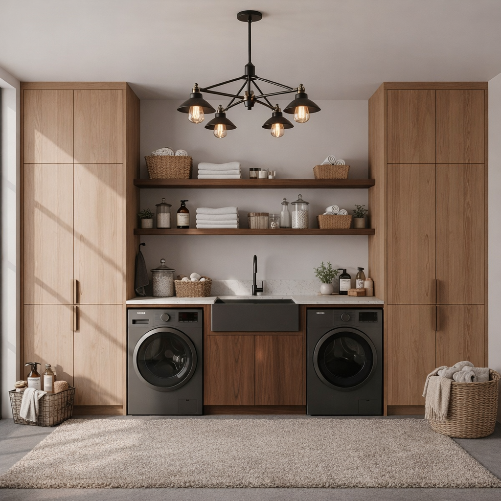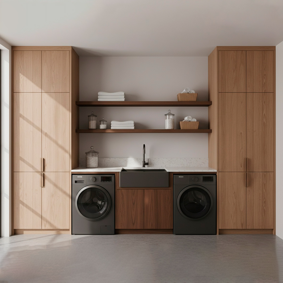 Фурнитура Blum обеспечивает исключительный комфорт в эксплуатации: петли и выдвижные элементы с доводчиками работают плавно и бесшумно, гарантируя надежность и долговечность даже при интенсивном использовании. Интеграция стиральной и сушильной машин выполнена аккуратно и эстетично, превращая техническую зону в полноценное интерьерное решение.