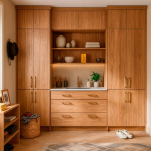 Выдвижные модули оснащены фурнитурой Blum, обеспечивающей плавный, бесшумный ход и эталонную долговечность. Все поверхности покрыты экологичными итальянскими лакокрасочными материалами, подчёркивающими текстуру дерева и надёжно защищающими её от влаги и ежедневных нагрузок.