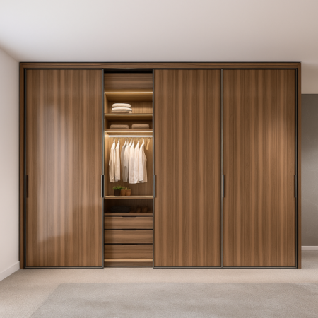 Комплексная система хранения «Фиорелли» выполнена из ценных пород древесины и облицована шпоном ореха экстра-класса, раскрывающим глубокий природный рисунок и мягкий золотисто-медовый тон массива. Чёткая геометрия фасадов, изящная интегрированная подсветка и акценты в виде лаконичных металлических ручек создают элегантный современный образ премиального уровня.