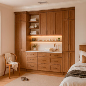Все выдвижные элементы оснащены фурнитурой Blum, обеспечивающей безупречно плавный и тихий ход, а дверцы — надёжной и долговечной фиксацией. Поверхности покрыты экологичными итальянскими лакокрасочными материалами, сохраняющими естественную текстуру дерева и защищающими её от влаги, бытовых нагрузок и потёртостей.