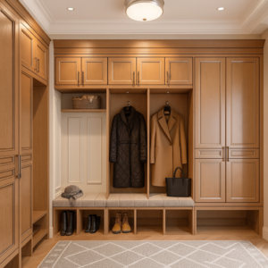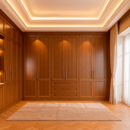Фурнитура Blum используется во всех распашных элементах, обеспечивая плавный, бесшумный ход дверей, точную геометрию закрывания и высокую надёжность при ежедневной эксплуатации. Внутреннее пространство продумано для удобного хранения одежды и аксессуаров, сочетая функциональность с безупречным внешним видом.