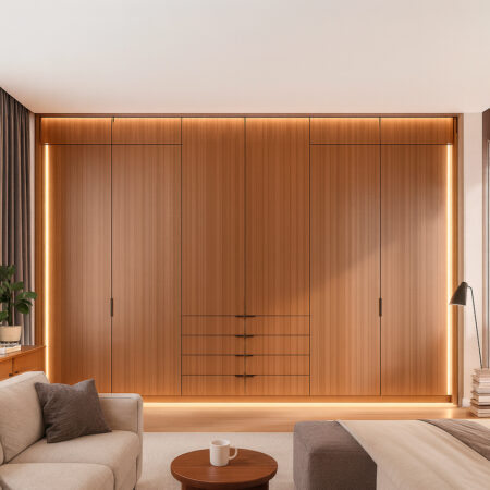 Гардеробная система "Салонеро" выполнена в эстетике сдержанного люкса, где чистая геометрия фасадов подчёркнута тонкой вертикальной световой линией, создающей эффект архитектурной глубины и визуальной лёгкости. Лаконичный силуэт и безупречные пропорции делают изделие выразительным элементом современного интерьера.