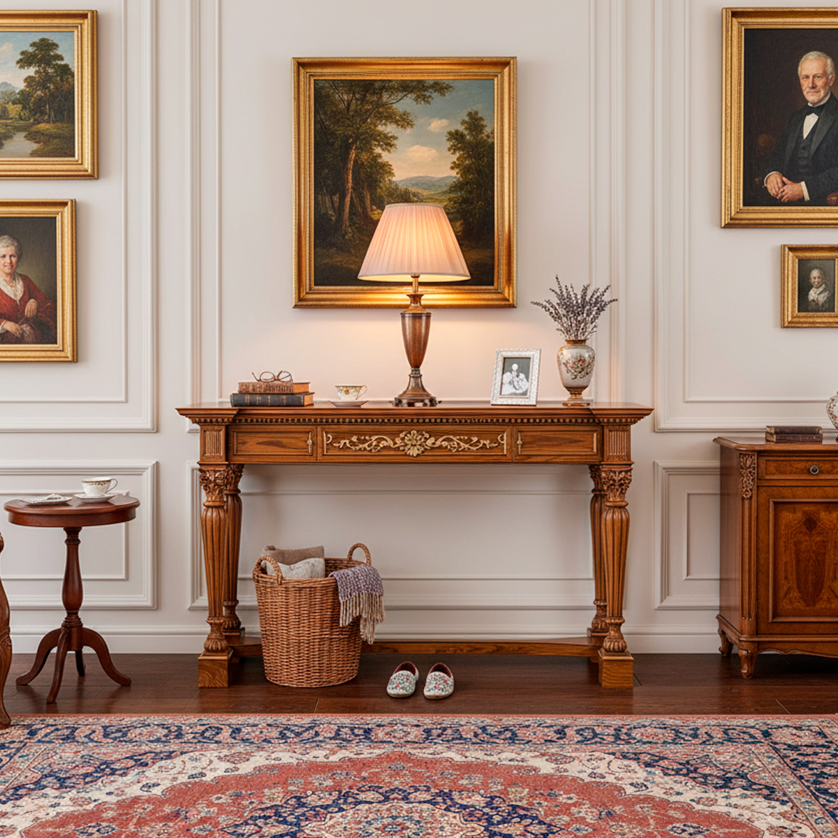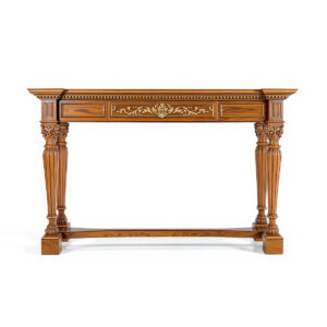 Изысканная резьба, пластичные завитки ножек и утончённый рисунок столешницы создают ощущение художественной монументальности, а глубокий тёплый тон ореховых волокон наполняет конструкцию природной насыщенностью и визуальным богатством.