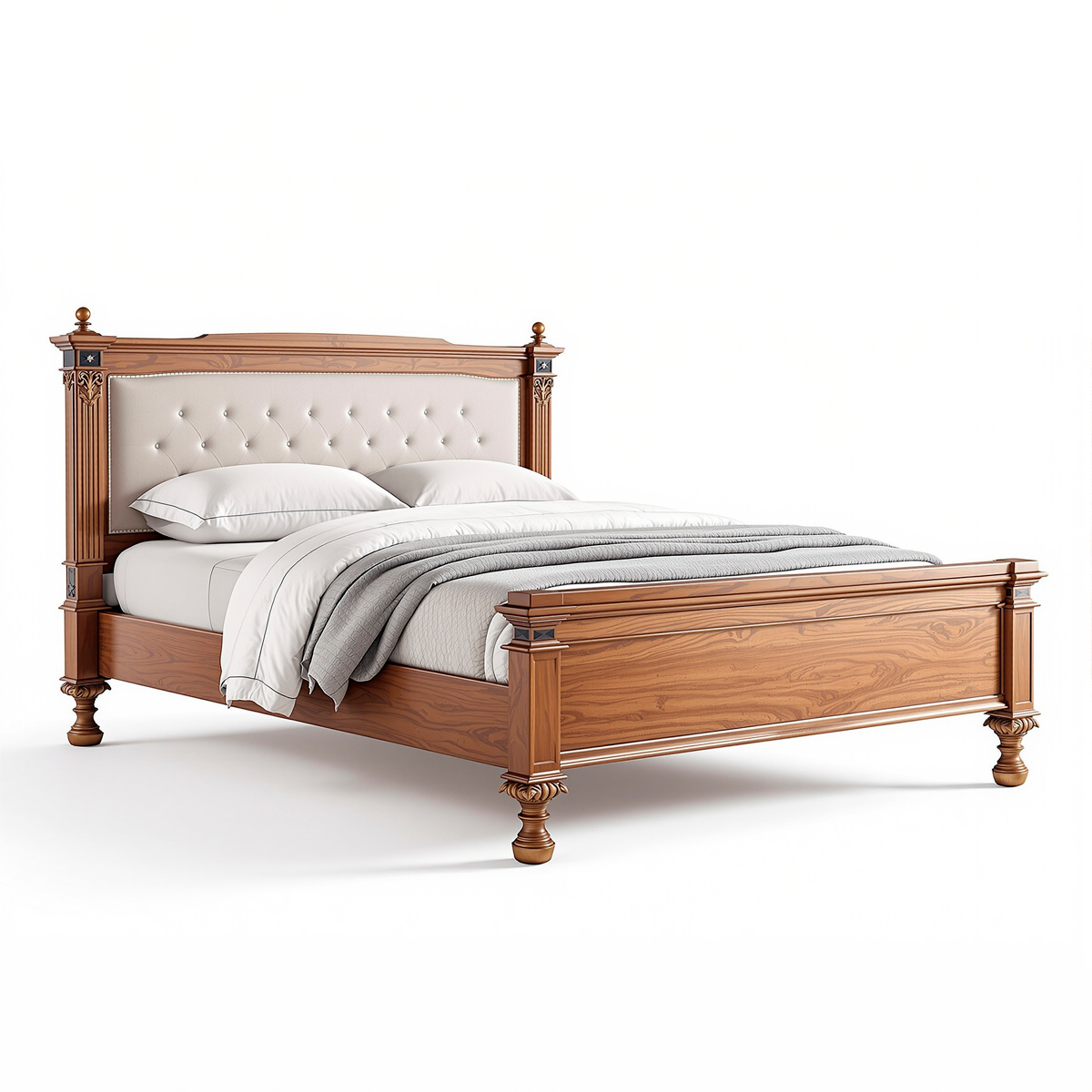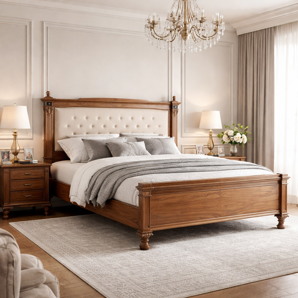 Высокое мягкое изголовье с изысканной каретной стяжкой обтянуто тактильно приятной тканью светлого тона, создавая выразительный контраст с древесиной и обеспечивая максимальный комфорт для отдыха и чтения. Декоративные элементы и пропорции выполнены с ювелирной точностью, без избыточного декора — строго, элегантно и дорого.
