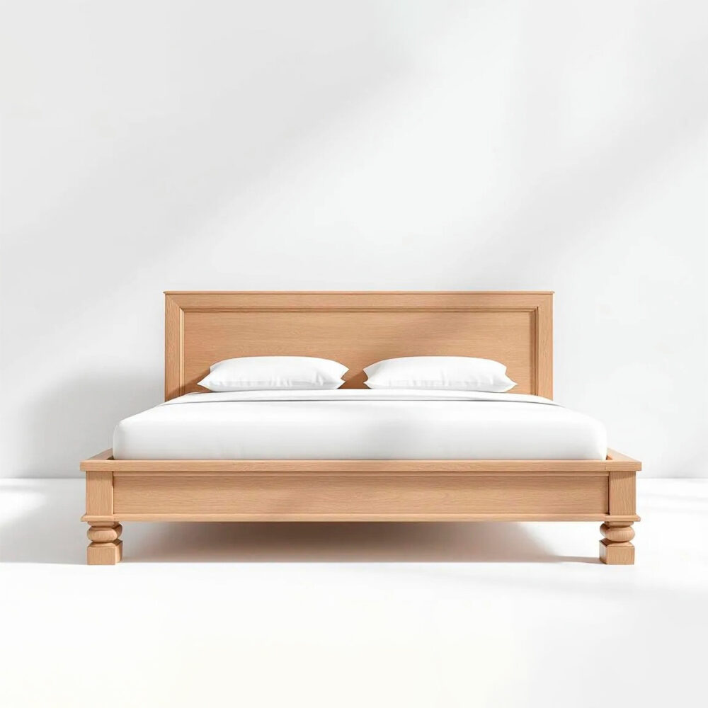 Основание и изголовье выполнены из ценных пород древесины и облицованы шпоном дуба экстра-класса, подчёркивающим природную текстуру с тонкими, спокойными волнами и характерным матовым свечением. Светлый дуб делает модель визуально лёгкой и универсальной для любого интерьера.