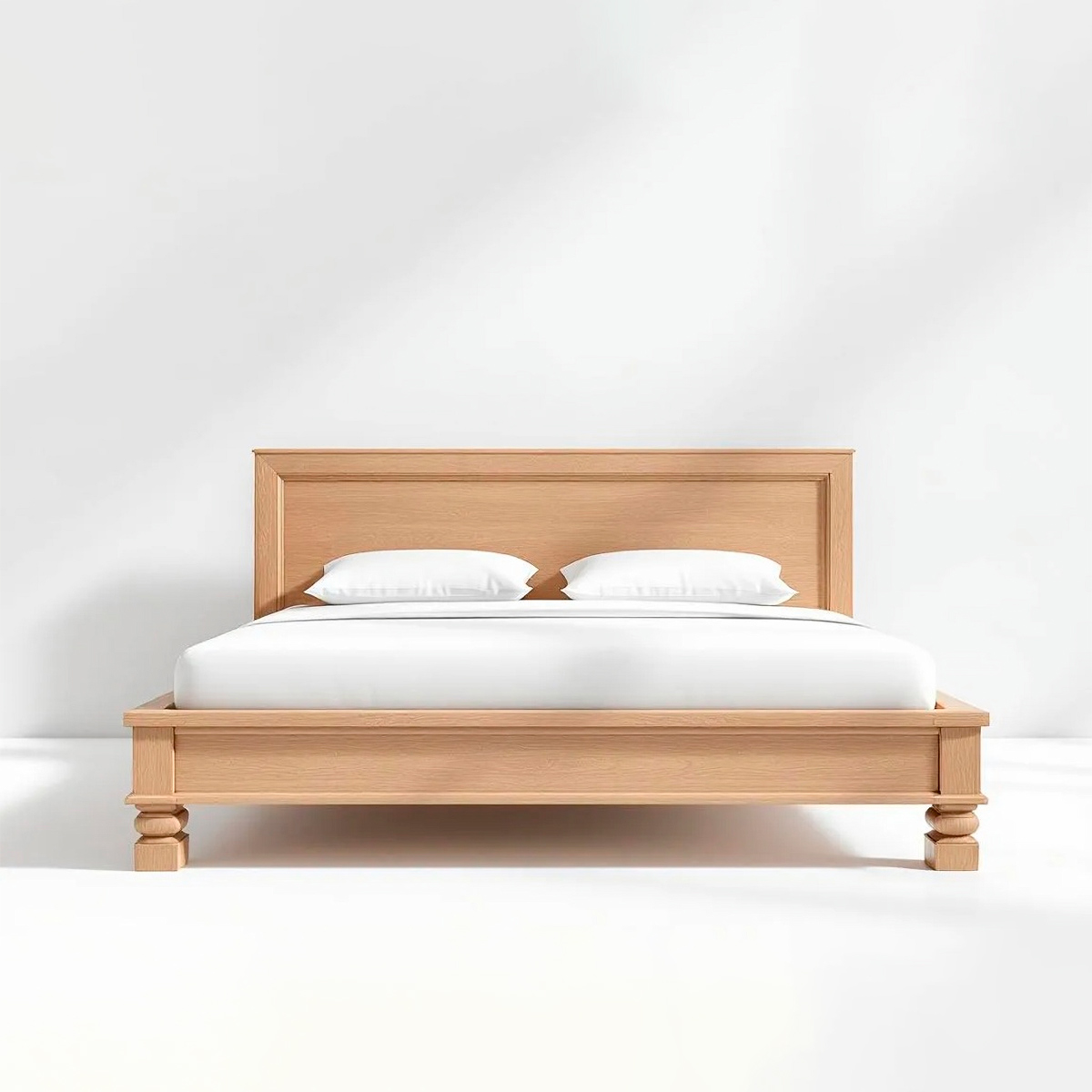 Фасады и изголовье облицованы шпоном ясеня экстра-класса с выразительным линейным рисунком: светлые волны, аккуратные завитки и естественные переливы текстуры создают ощущение цельного массива. Геометричная рамочная конструкция придаёт модели архитектурную чёткость, а массивные опоры добавляют устойчивости и визуального веса.