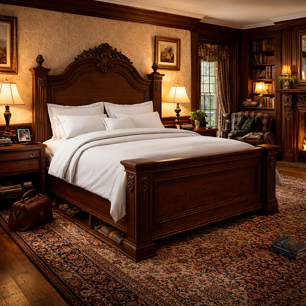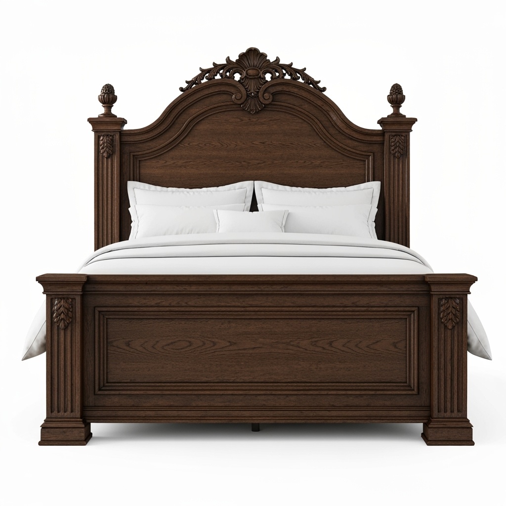 Кровать «Калм» из массива и шпона дуба экстра-класса олицетворяет статусную классику и безупречное качество исполнения. Монументальное изголовье с выразительным резным декором и архитектурными элементами придаёт модели величественный и благородный характер, подчёркивая природную силу и долговечность дуба.