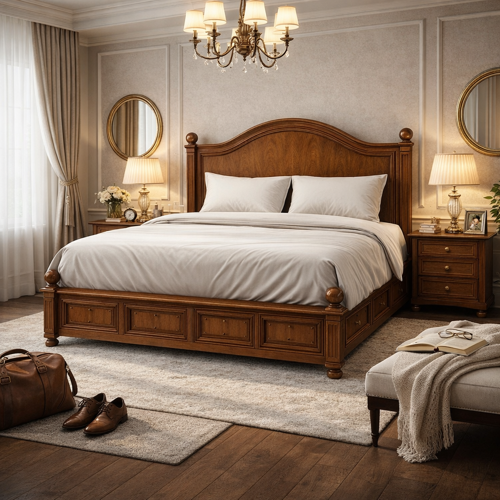Кровать «Плейн» станет центральным элементом спальни в интерьерах в стиле классика, неоклассика и традиционный премиальный интерьер, объединяя комфорт, утончённую эстетику бука и европейское качество исполнения.