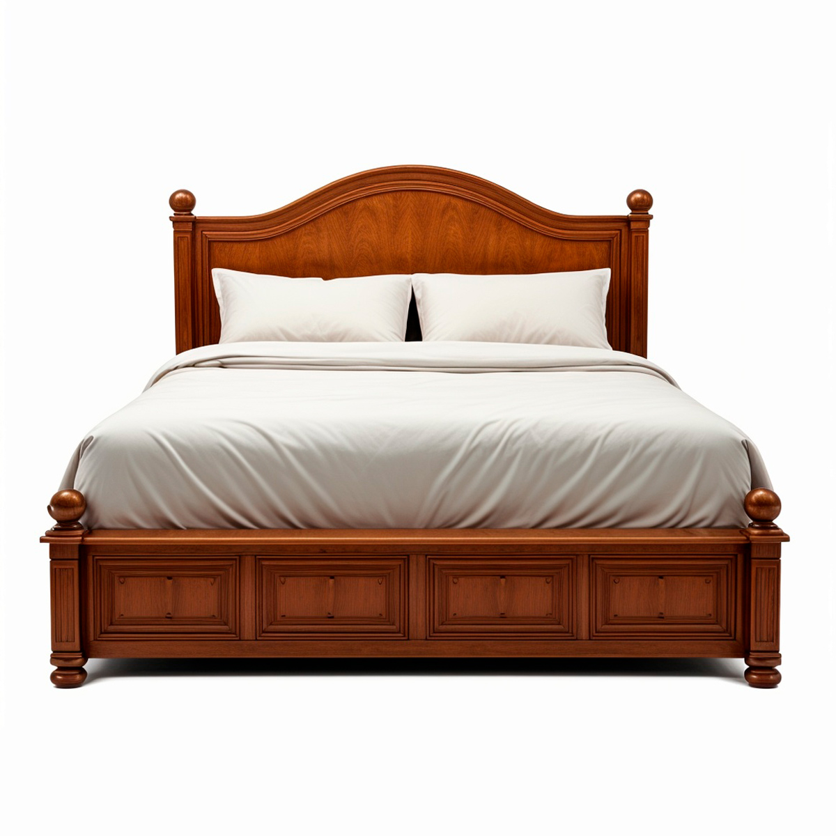 Плавно изогнутое изголовье с декоративным профилированием и точёными акцентами формирует гармоничный, симметричный образ, а массивное основание с филёнчатыми элементами подчёркивает основательность и долговечность конструкции. Выверенные пропорции делают кровать визуально лёгкой, сохраняя при этом ощущение надёжности и статуса.