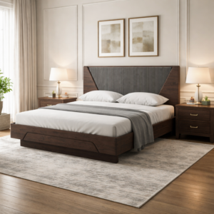 Корпус кровати отличается чёткой геометрией и мягко скруглёнными линиями, а высокое изголовье с текстурной вставкой добавляет композиции глубину и элегантный акцент. Продуманная форма основания создаёт эффект визуальной лёгкости, сохраняя при этом надёжность и устойчивость конструкции.