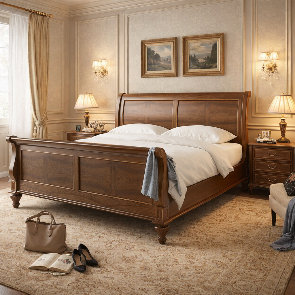 Кровать "Модена"— воплощение спокойной классики и светлой благородной эстетики натурального дерева. Мягкие пропорции, деликатная лепнина и архитектурные детали на стойках создают атмосферу утончённой неоклассики, оставаясь при этом лёгкими и современными.