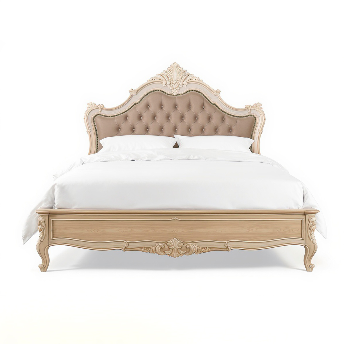 Высокое изголовье украшено мягкой капитоне и обрамлено сложной художественной резьбой с флоральными мотивами, выполненной с высокой точностью. Плавные линии, изогнутые ножки и декоративные элементы по периметру основания формируют гармоничный силуэт и подчёркивают ручную работу мастеров.