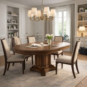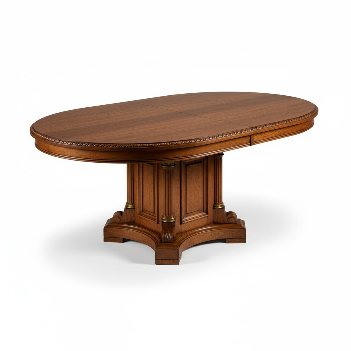 Обеденный стол «Альпина» в классическом стиле — гармония плавных линий и архитектурной выразительности. В основе изделия используется массив дуба, отличающийся прочностью, благородной текстурой и тёплым натуральным оттенком. Монументальная центральная опора с декоративными элементами и аккуратный резной кант по периметру столешницы формируют солидный и уравновешенный образ.