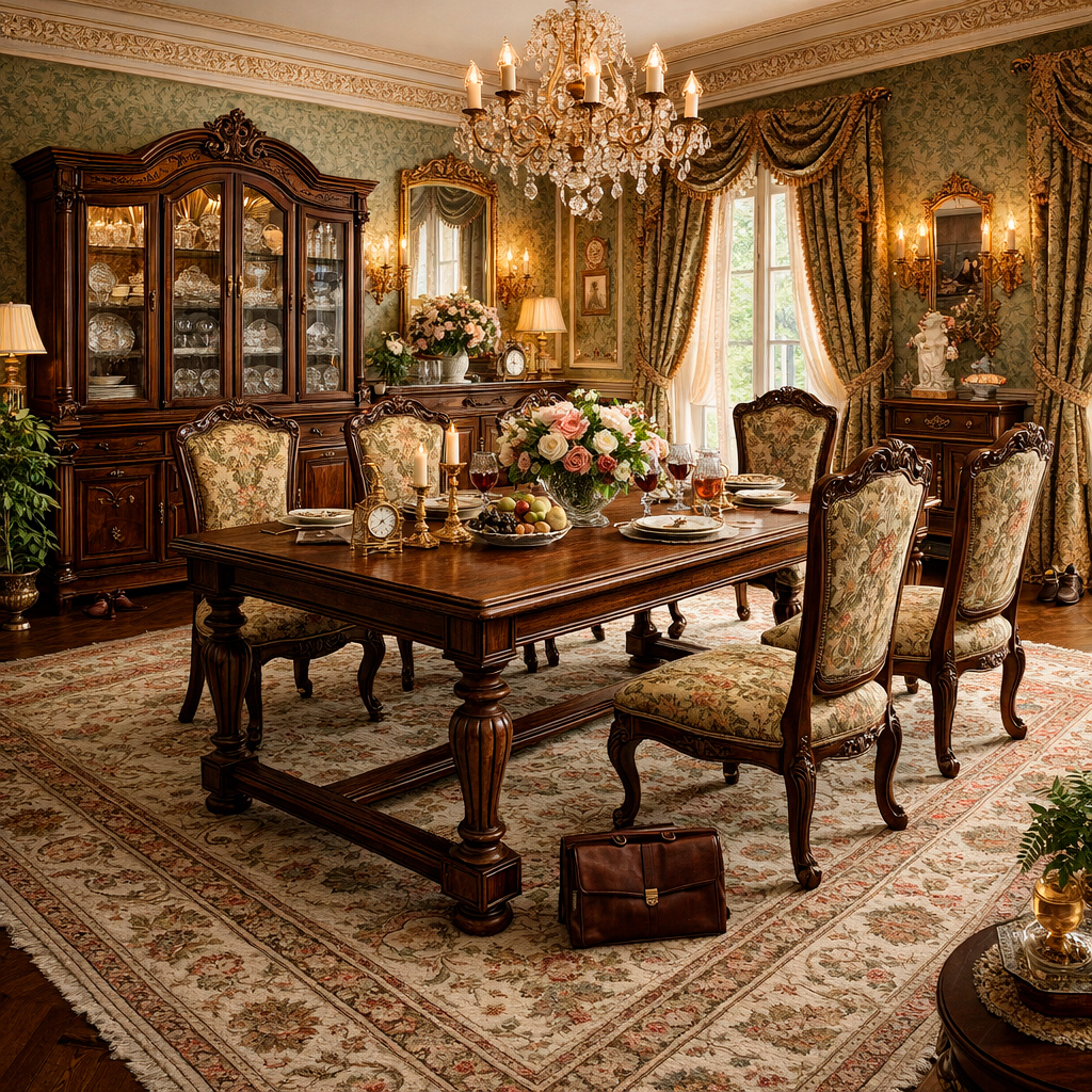 Обеденный стол «Эстарио» органично вписывается в интерьеры классический стиль, неоклассика, английская классика, традиционный интерьер. Он станет центральным элементом столовой или гостиной, формируя атмосферу уюта, статуса и безупречного вкуса.