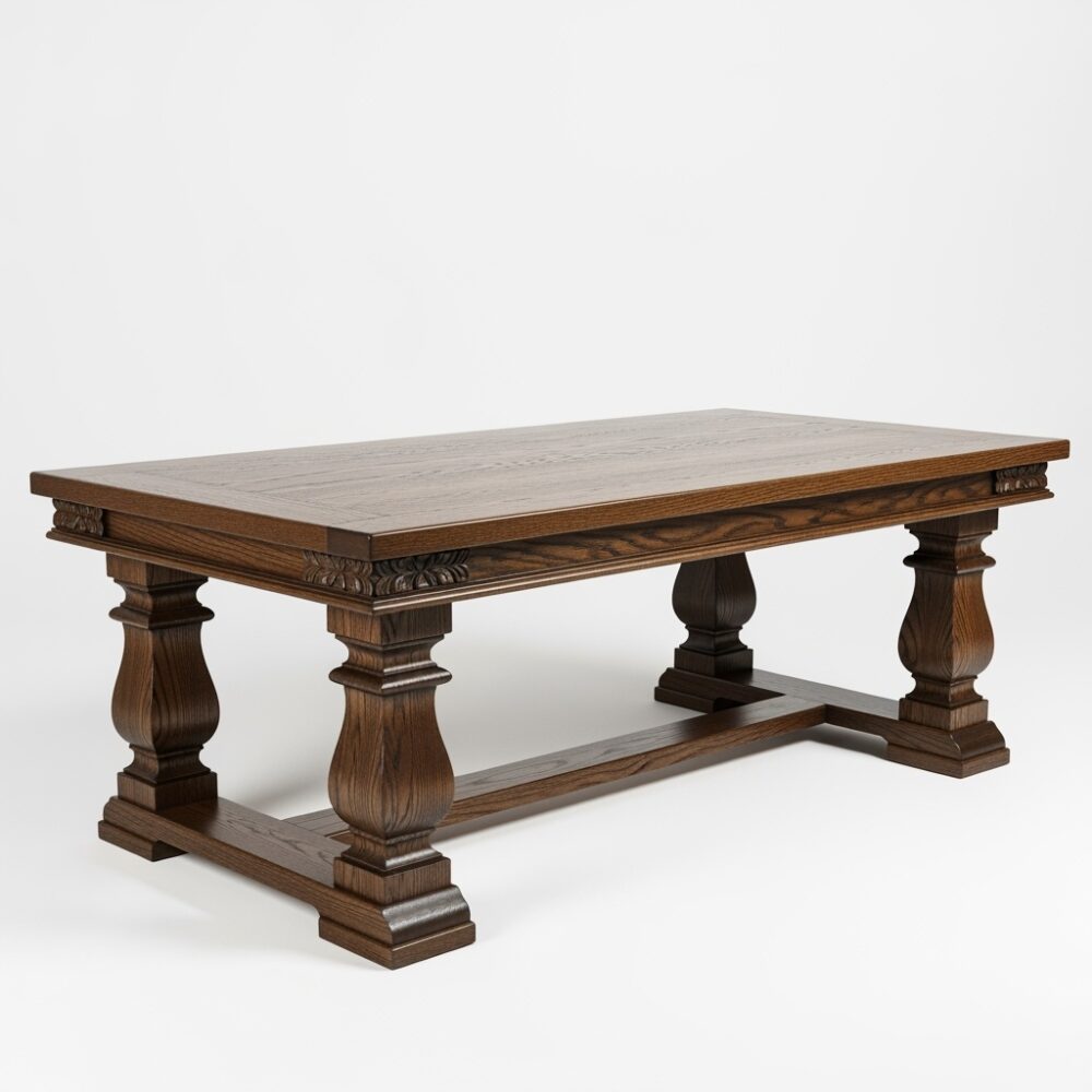 Обеденный стол "Изабель"— воплощение изысканной классики, где гармонично сочетаются благородная фактура дуба и филигранная ручная резьба. Массивная столешница облицована шпоном дуба экстра-класса, подчёркивающим природный рисунок древесины: волнообразные линии, мягкие переливы и глубокие карамельные полутона.