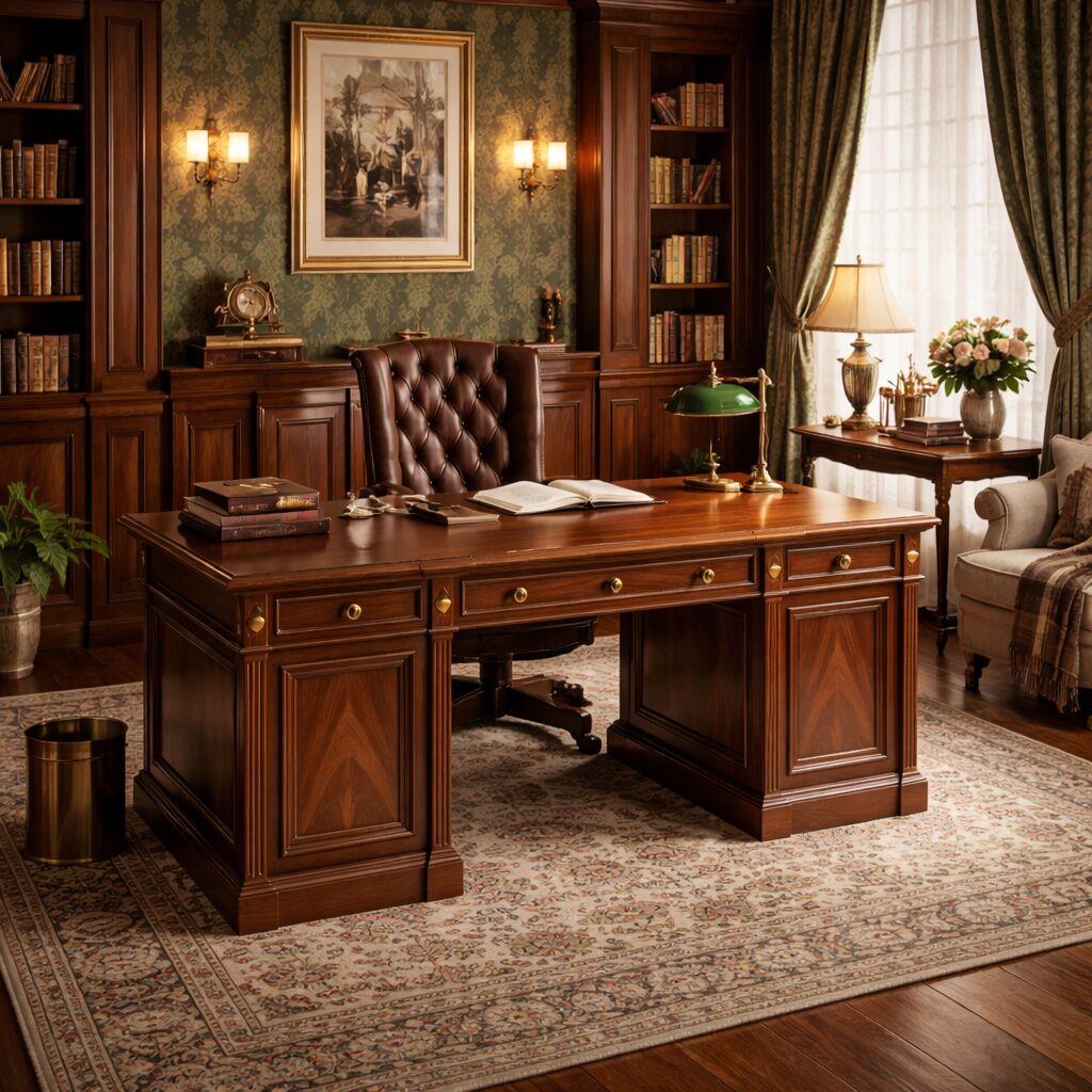Это не просто рабочее место, а выразительный центр кабинета, подчеркивающий статус, вкус и деловую респектабельность владельца.