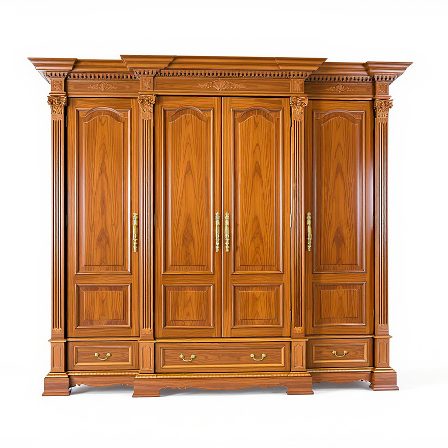 Шкаф «Гроссвальд» — выразительное воплощение европейской неоклассики, сочетающее монументальность архитектурных форм и утончённую благородную эстетику. Чёткий ритм фасадов, каннелированные колонны с резными капителями, массивный карниз и выверенные пропорции создают ощущение статусности и безупречного вкуса.