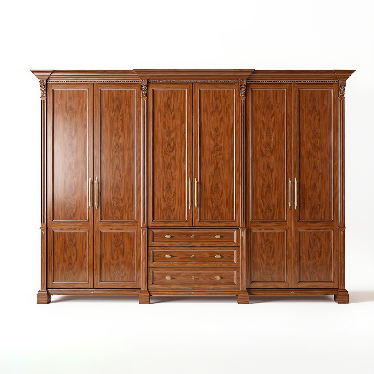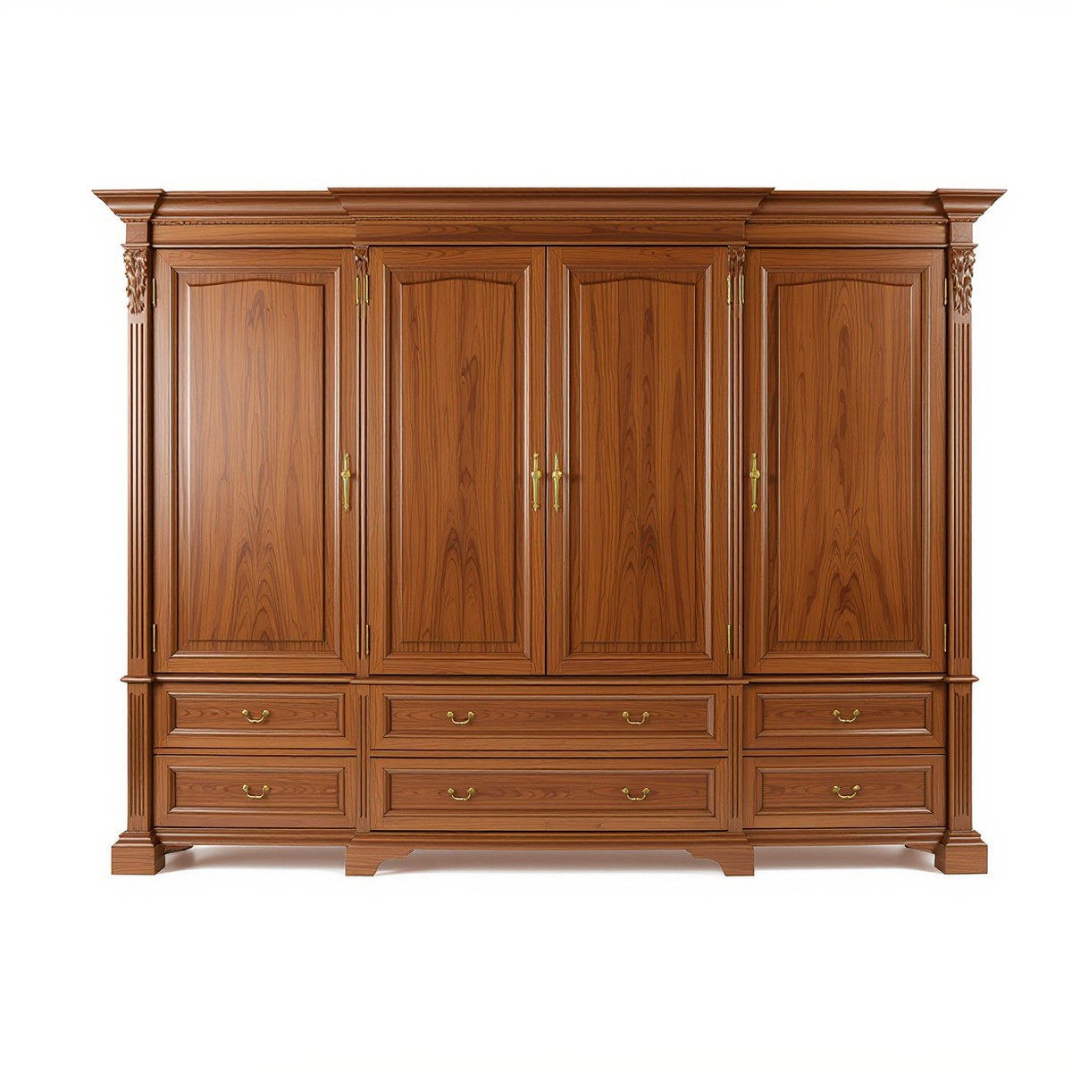 Шкаф «Эстетика» выполнен из массива ореха — одной из самых ценных и выразительных пород древесины, отличающейся глубокой текстурой и благородным тёплым оттенком. Классические филёнчатые фасады, массивный карниз и аккуратные пилястры формируют уравновешенный, статусный образ, подчёркивающий архитектурную строгость и элегантность изделия.