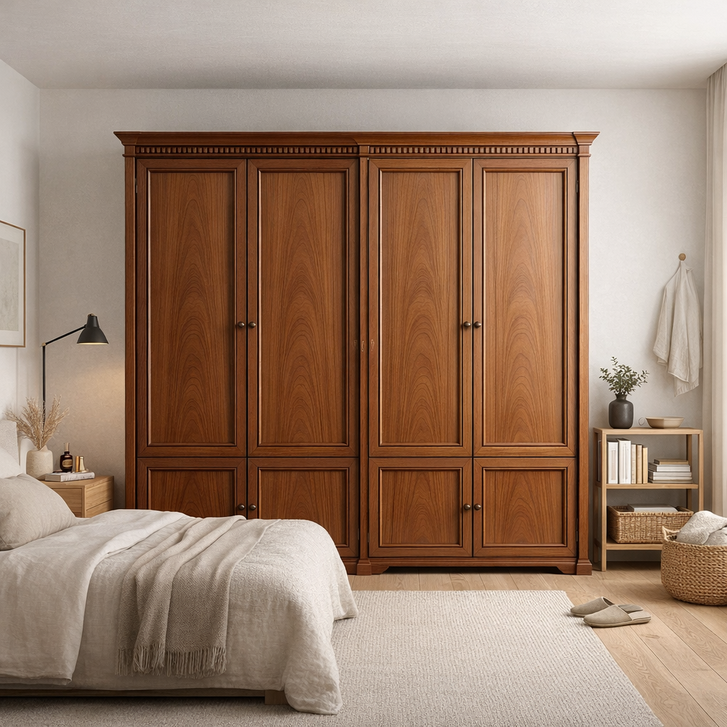 Изготовленная из ценных пород древесины и облицованная шпоном дуба экстра-класса, она сочетает природную теплоту и строгую элегантность. Покрытие выполнено экологичными итальянскими лакокрасочными материалами, подчёркивающими естественную текстуру и обеспечивающими долговечность поверхности.