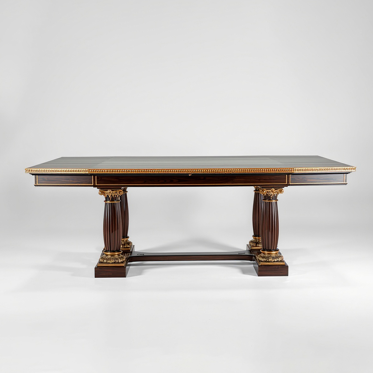 Широкая столешница с изящным профилированным кантом и декоративным фризом подчёркивает статусный характер модели. Массивные колоннообразные опоры с каннелюрами и художественными элементами создают ощущение монументальности, а изогнутая нижняя перемычка придаёт конструкции завершённость и дополнительную жёсткость.