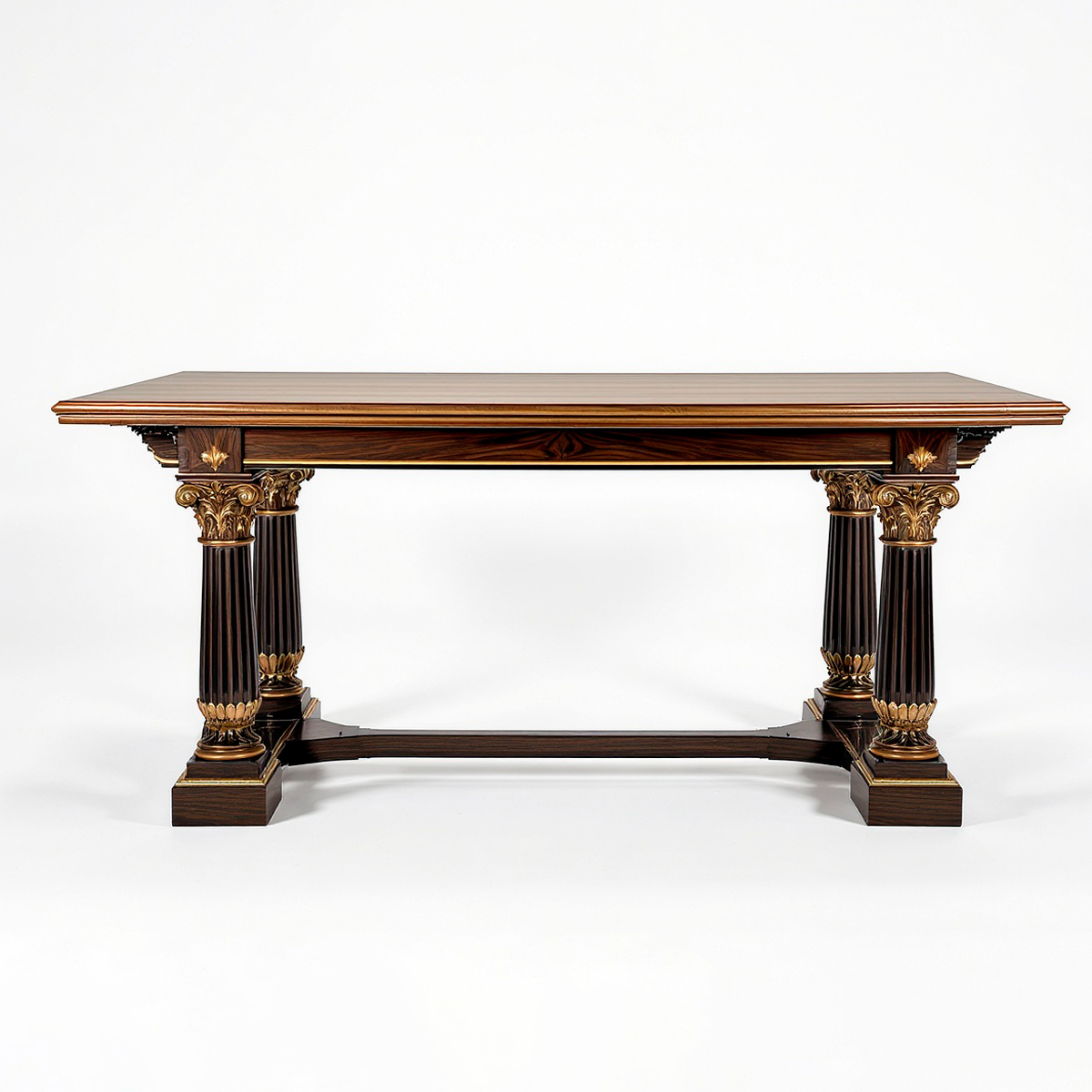Стол «Фонтен» в дворцовом стиле — воплощение торжественной классики и безупречного мастерства исполнения. В основе изделия используется массив ореха, отличающийся глубокой текстурой, насыщенным тёмным оттенком и выразительным природным рисунком. Архитектурные опоры в виде каннелированных колонн с декоративными капителями и изящными золотыми акцентами придают модели статусность и художественную выразительность.
