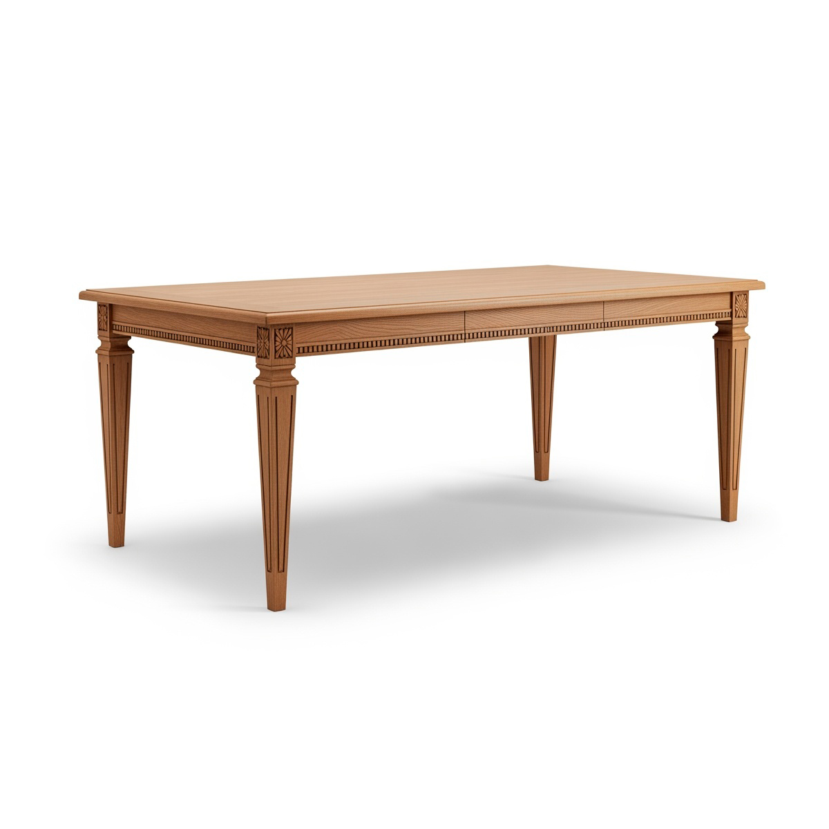 Стол «Грандесса» в утончённой классической интерпретации — образец баланса лёгкости и архитектурной строгости. Изделие выполнено из массива ясеня, ценимого за прочность, стабильность и выразительный естественный рисунок древесины. Тонко профилированный пояс и изящные конические ножки с деликатной фрезеровкой придают конструкции визуальную лёгкость при полной конструктивной надёжности.
